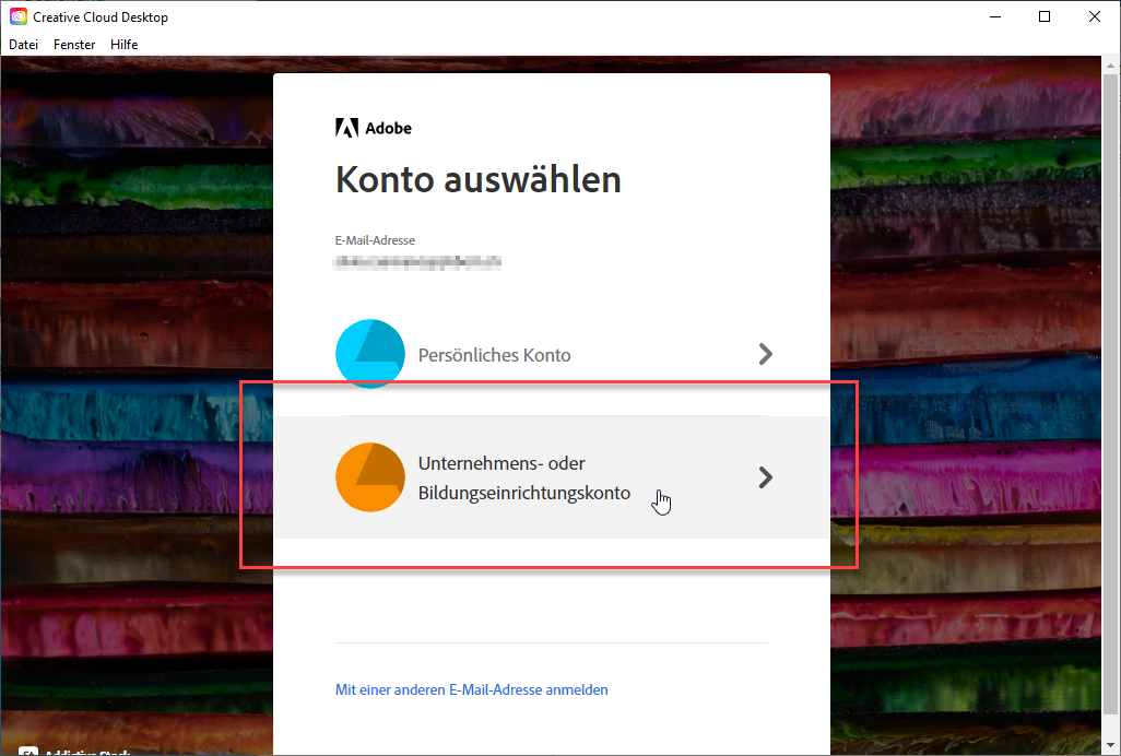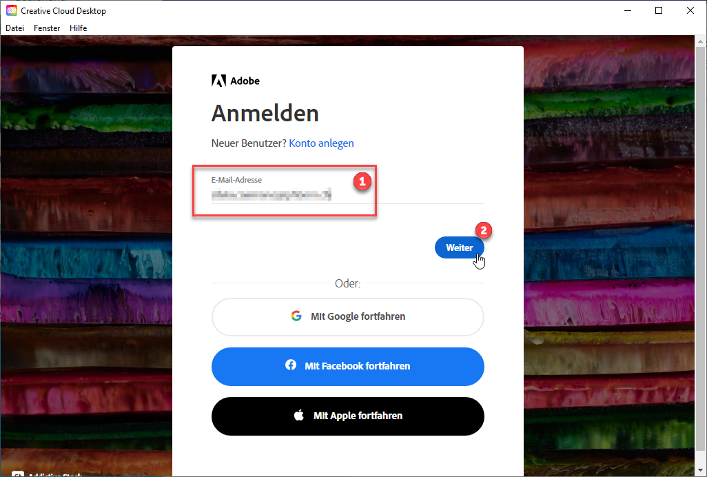 Anmeldung Adobe Creative Cloud
