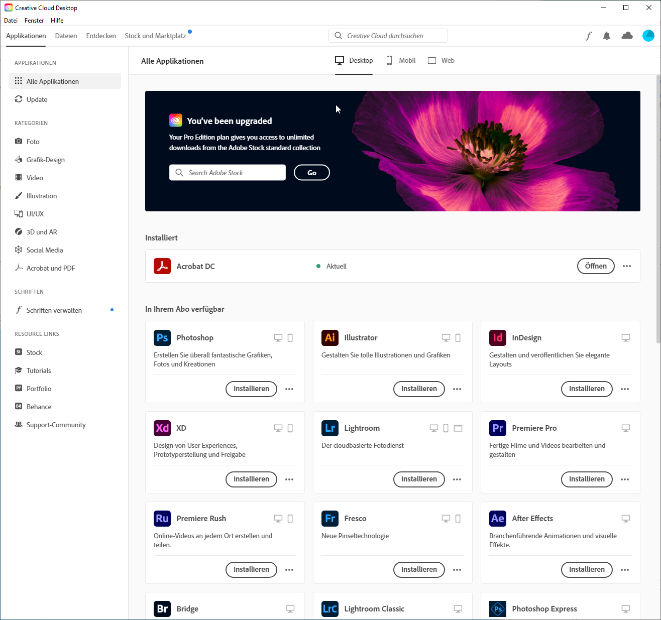 Folgende Anleitung ist für Windows beschrieben. Auf Mac funktioniert die Anmeldung grundsätzlich gleich, allerdings wird das entweder über den Browser gemacht oder nach öffnen einer Adobe App.