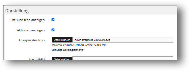 Das Icon muss im SVG-Format vorliegen (Dateiendung “.svg”). Eine grosse Anzahl Icons, die nach Stichwörtern gesucht werden können, stehen z.B. auf folgenden Seiten zur Verfügung: