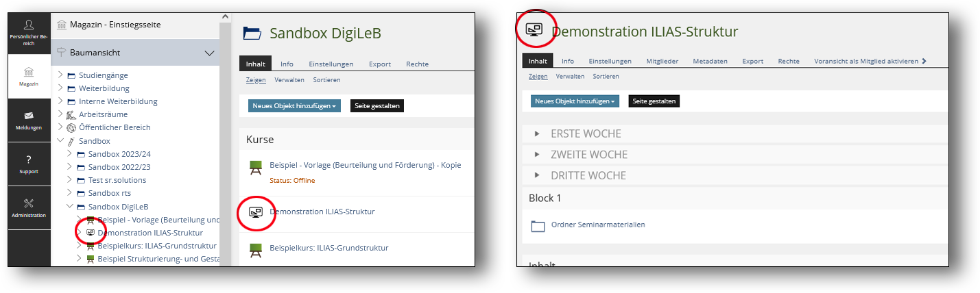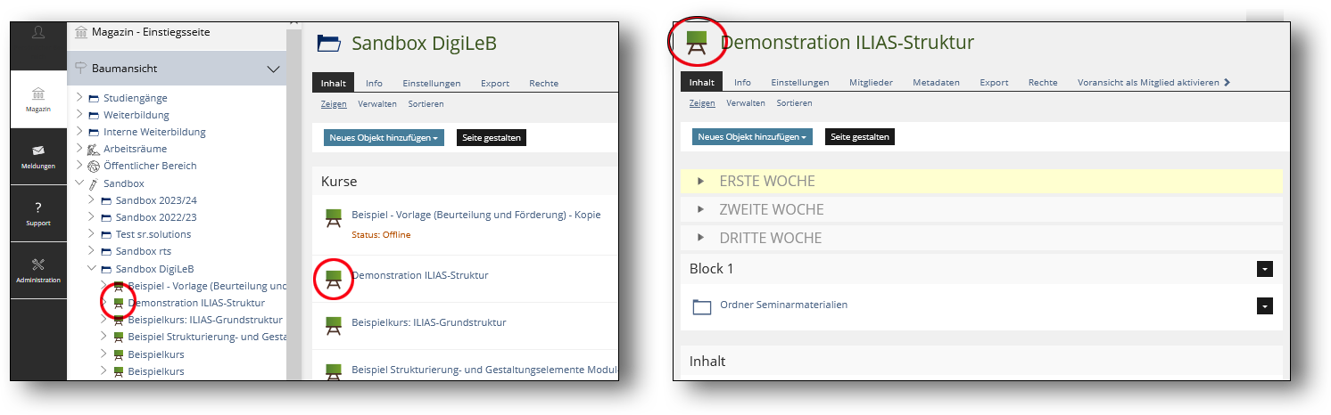 In ILIAS besitzen alle Objekte ein Icon, das an verschiedenen Orten angezeigt wird: