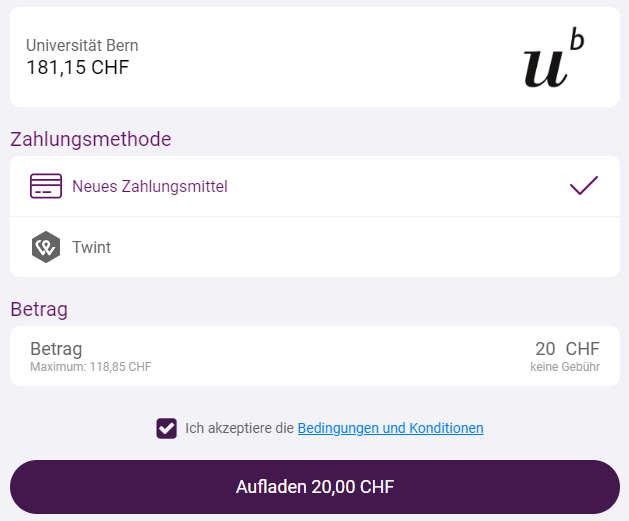 Auf der Seite Laden kann Guthaben auf das Konto geladen werden. Pro Aufladen kann minimal CHF 20 aufgeladen werden. Das Maximalguthaben beträgt CHF 300.