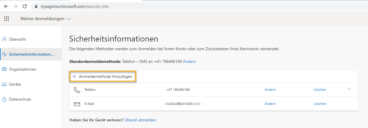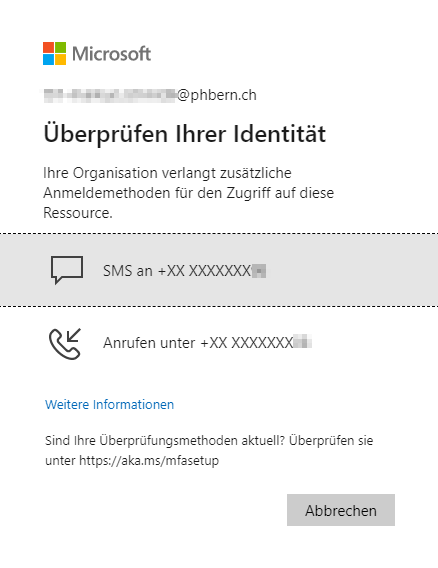 Möglicherweise haben Sie vorgängig bereits eine Telefonnummer zur Überprüfung Ihrer Identität registriert. Andernfalls werden Sie in Schritt 4 aufgefordert eine Anmeldemethode zur Überprüfung Ihrer Identität zu registrieren.