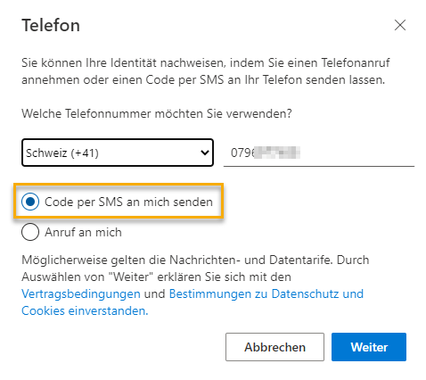 Möglicherweise haben Sie vorgängig bereits eine Telefonnummer zur Überprüfung Ihrer Identität registriert, dann ist dieser Schritt nicht mehr notwendig.