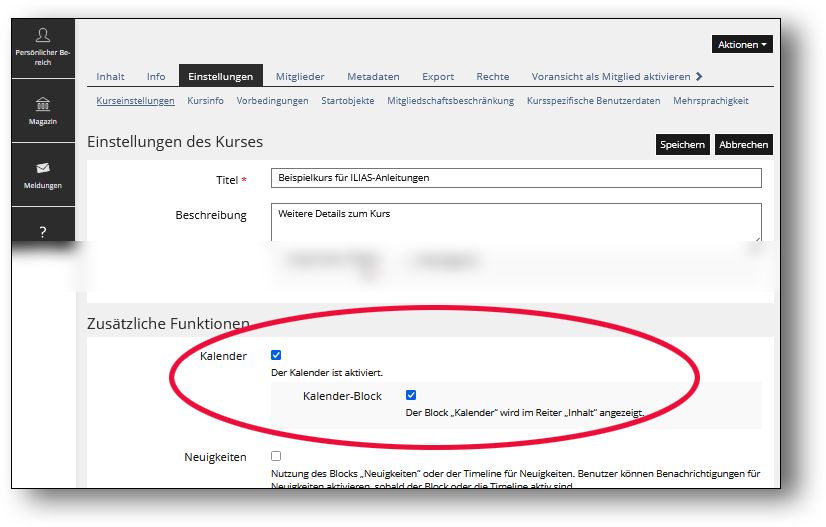 Die Einstellungen des Kalenders findest du über den Reiter Einstellungen. Nach unten scrollen bis zum Abschnitt Zusätzliche Funktionen. Dort kannst die Verwendung des Kalenders gänzlich deaktivieren. Oder ihn aktiv lassen, und nur seine Darstellung auf der Kursübersichtsseite verhindern, indem du das Häkchen bei Kalender-Block entfernst. Dann Speichern.