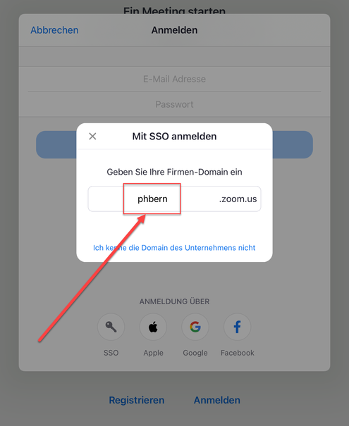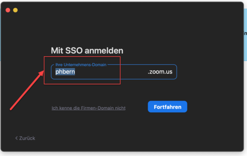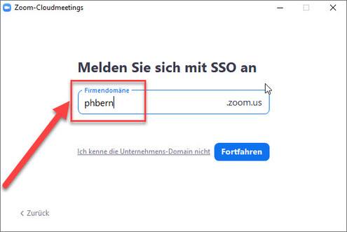 Damit Sie Zoom ohne Einschränkungen nutzen können, müssen Sie bei der ersten Anmeldung am Client das Anmeldeverfahren SSO und die Firmen-Domäne phbern verwenden.